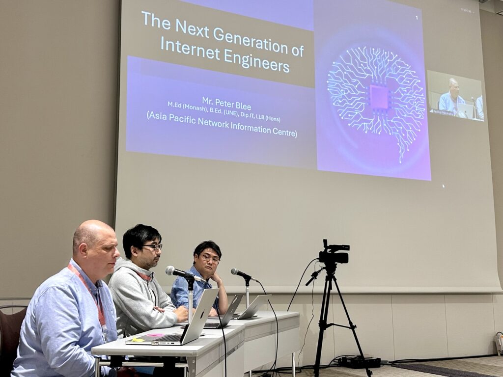 - Internet Engineer Education: Led by Keiko Okawa (Keio University), the discussion focused on the future of internet engineering education. Katsuhiro Horiba (AWS) and Peter Blee (APNIC) discussed AI’s impact on training programs. Kotaro Kataoka (IIT Hyderabad) shared insights on the challenges of making internet engineering an aspirational career, noting the shift in perception toward AI and its integration into the profession.