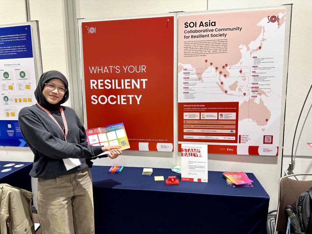 In addition to the presentations, the SOI Asia Showcase “Resilient Society” provided a dynamic and engaging opportunity for participants to explore the core concepts, latest updates, and outcomes of SOI Asia’s main activities: APIE, EBA, CBR, Inxignia, and the collaboration with ARENA-PAC. The exhibition featured a stamp rally, where participants visited booths, collected stamps, and received a special physical badge crafted by the students. The event concluded with encouraging remarks from Prof. Jun Murai, who emphasized the inspiring presence of a new generation of SOI Asia members, highlighting the importance of building a resilient and lasting future through collaboration and innovation.