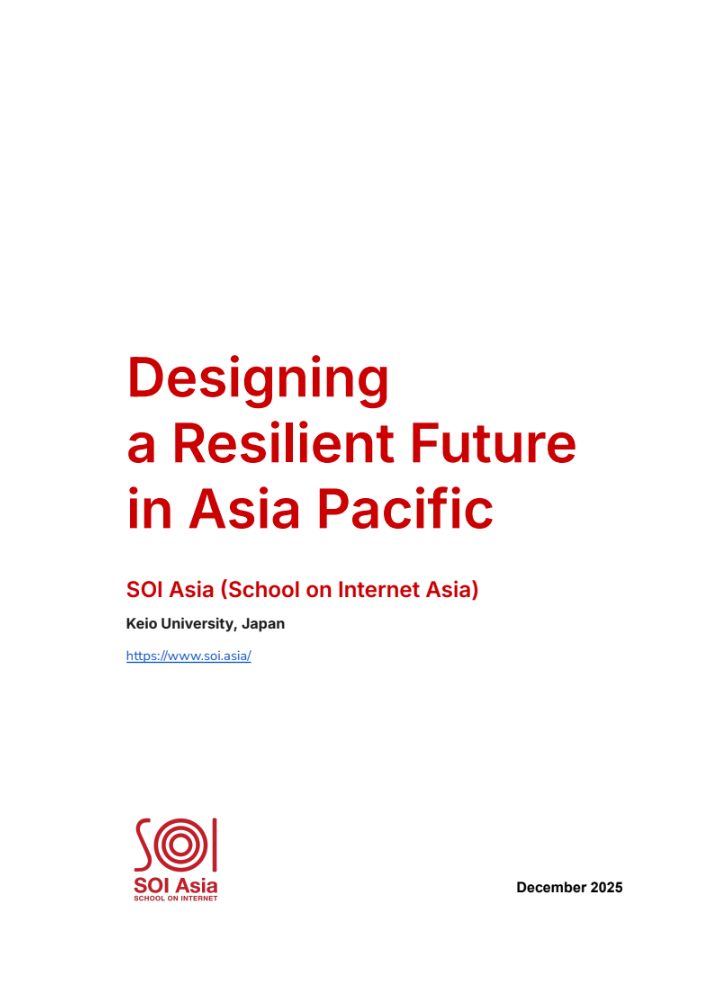 Since 2021, with the support of the APNIC Foundation, SOI Asia has entered a new phase of collaboration in research and education. In this phase, partners are working together toward a common goal. The project headquarter is based at Keio University in Japan and led by the principal investigator, Professor Keiko Okawa, with administrative support from the Asia Pacific Resilient Society Sub Project (APRS), Cyber Civilization Research Center (CCRC), and Keio University Global Research Institute (KGRI).